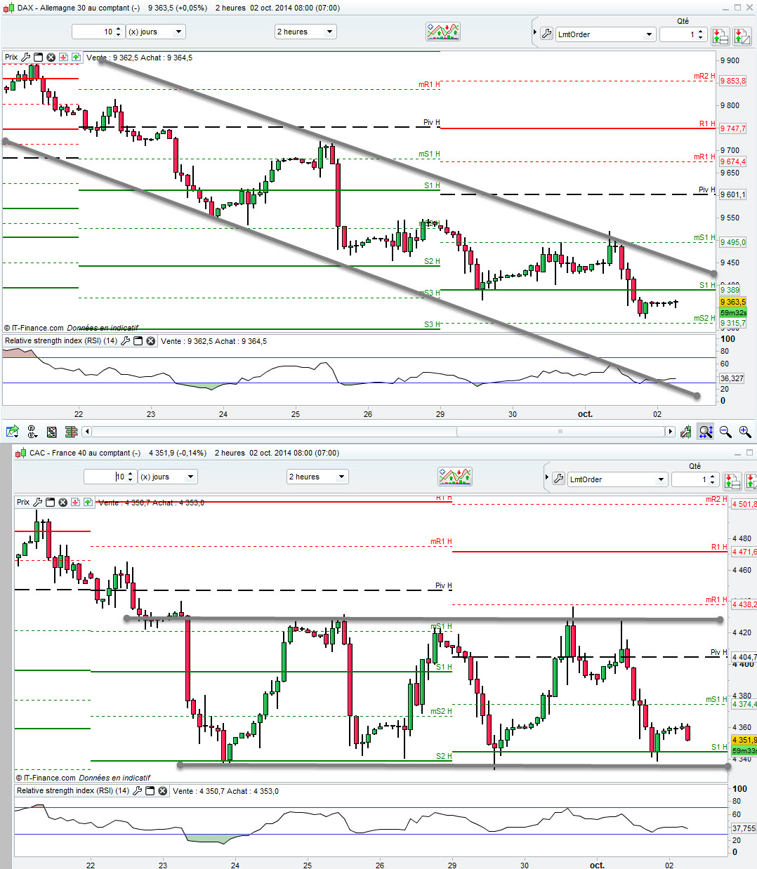 Wall Street a clairement cassé les 17.000 points sur le Dow Jones, le s&p 500 est sur les 1950, un point très important pour lui, le Japon a chuté de plus de 2.50% cette nuit (les événements à Hong Kong peuvent jouer)... bref on est plutôt sur un scénario baissier.