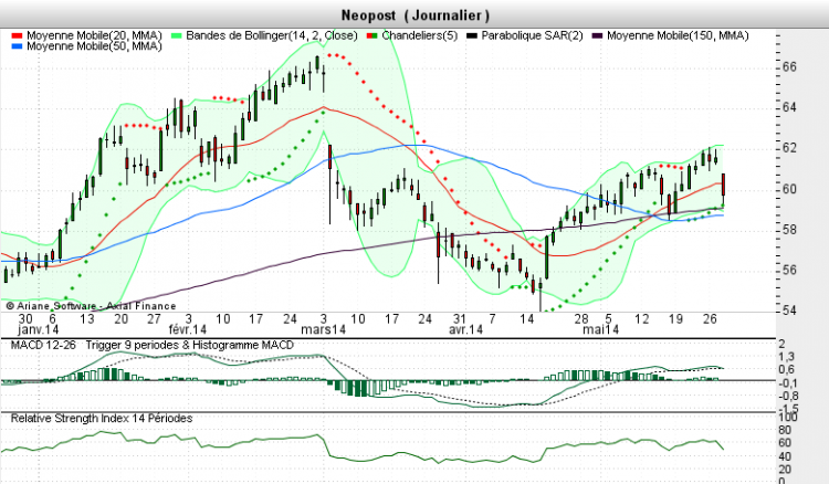 Neopost vient de casser une resistance de plus de 5 ans, apres avoir touche les 61,80% de fibonacci les cours sont revenus sur la resistance devenue support à 53,70€ ce qui a entraine un rebond l'action prend encore 1,65% aujourd'hui. Le premier objectif pourrait etre les 61€ puis 66€ avec un stop sous 53€