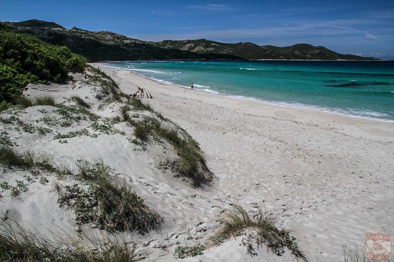 Sable blanc, eau turquoise, environnement sauvage et début du désert des Agriates.