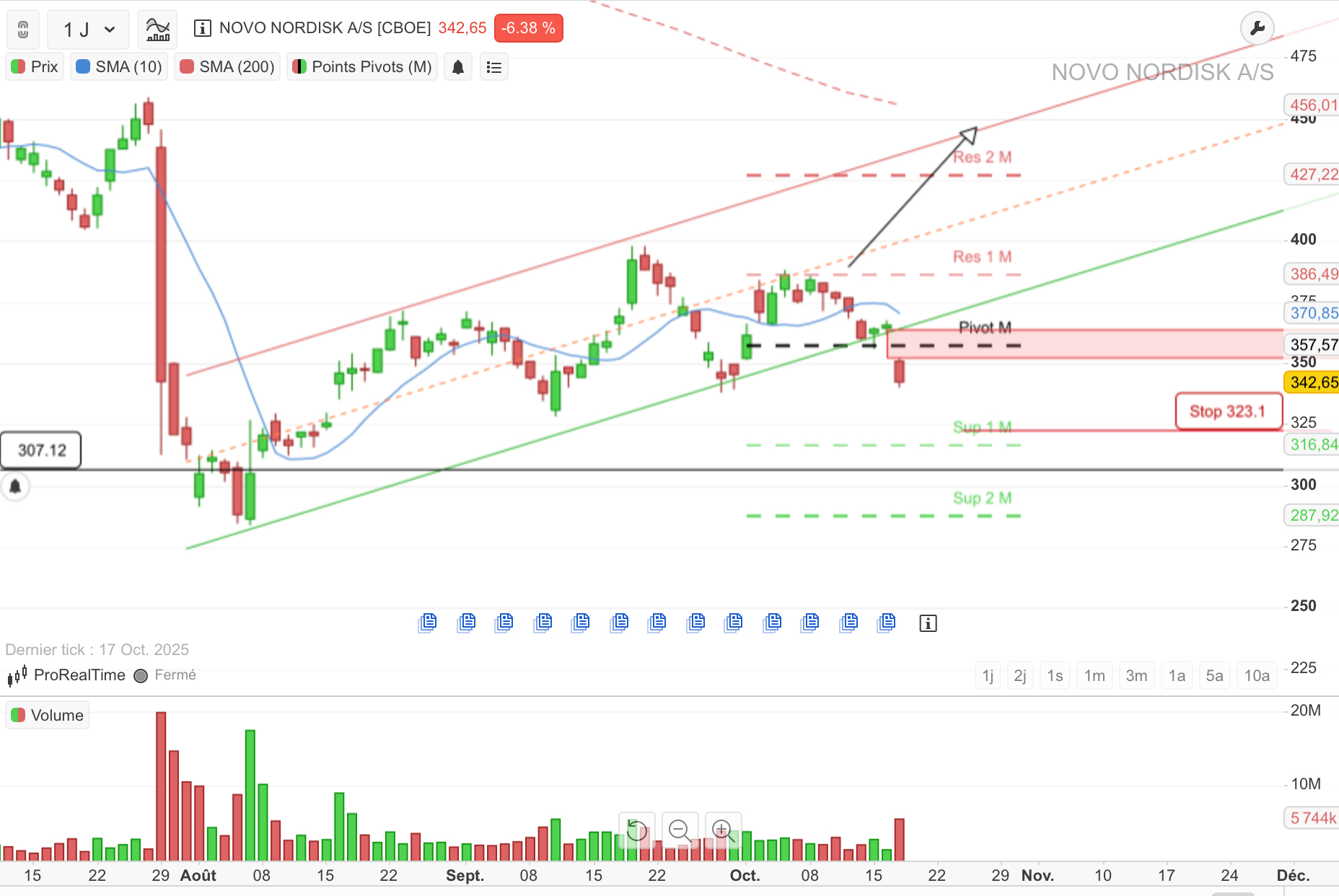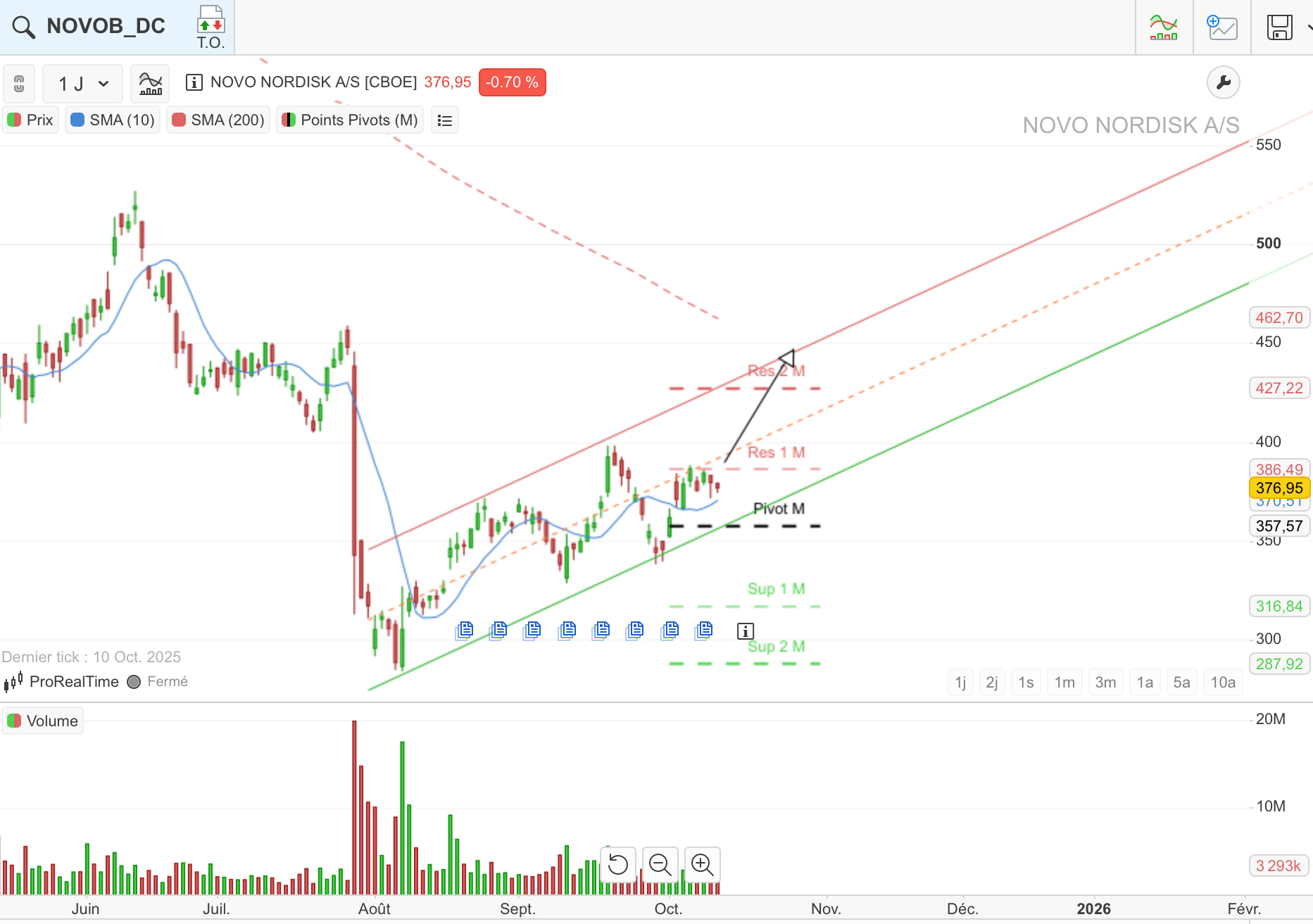 Concernant Novo Nordisk je suis dessus depuis quelque temps mais ça a beaucoup de mal à repartir, je vise le haut du canal à 450 DK